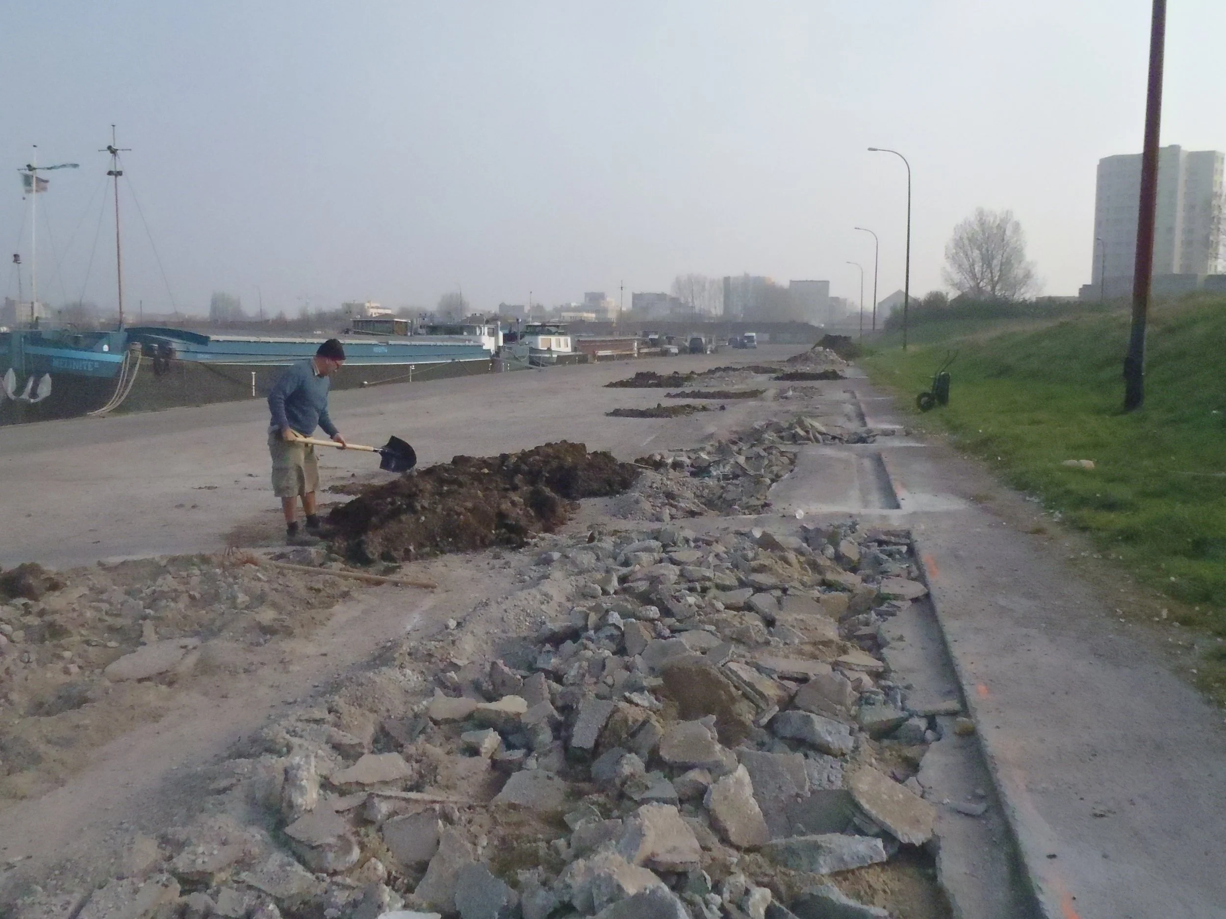 Pour permettre une mise en œuvre rapide et à grande échelle, le projet s’appuie sur les équipes de maintenance routière de la Communauté urbaine de Dunkerque et sur leurs équipements lourds : brise-roche hydraulique, raboteuses et scies diamant. Ces outils conditionnent à la fois la méthode et le dessin du jardin. Celui-ci se structure en grandes bandes paysagères, différenciées par des degrés variables de travail du sol : simple fracturation de la dalle ou fracturation associée à un mélange des matériaux in situ.